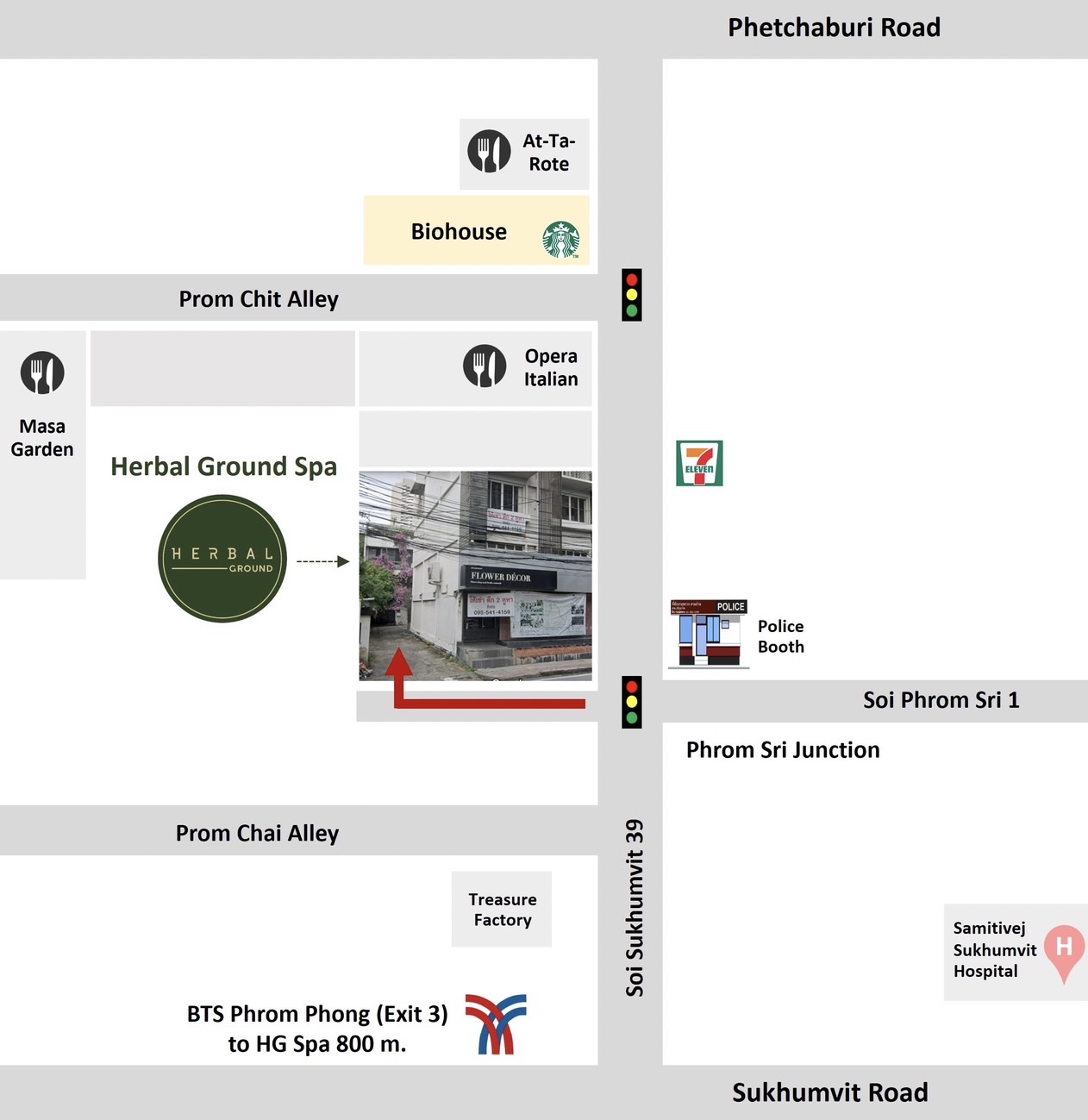 if walk about 10 minutes or take a motorcycle/ taxi about 4 minutes. Go straight on until you reach traffic lights junction. Turn left into an alley (opposite Soi Phromsri 1) just 10 metres to our spa.